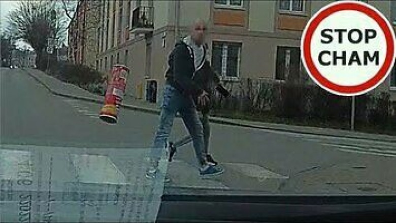 Pieszy chciał mnie pobić w obecności swojej małej córki. Oddalił się dopiero jak pokazałem, że mam kamerę i powiedziałem, że zgłoszę go na policję."
