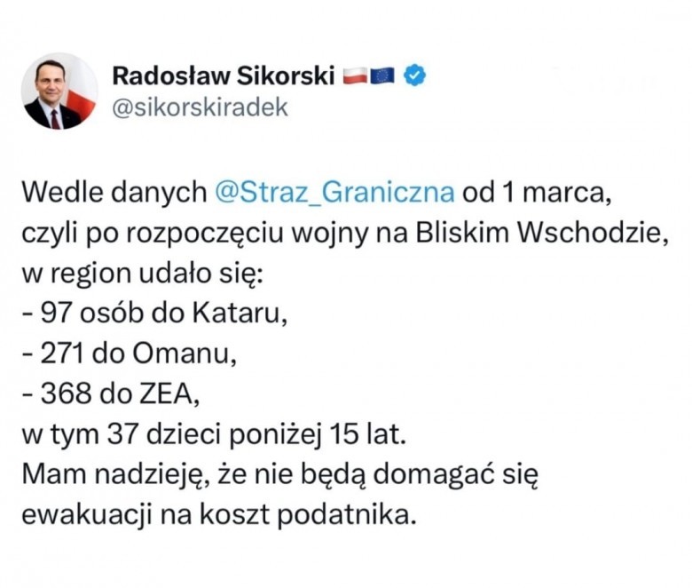 Największe emocje wzbudził jednak komentarz szefa MSZ. Radosław Sikorski napisał, że ma nadzieję, iż osoby lecące na Bliski Wschód mimo ostrzeżeń nie będą później domagały się ewakuacji na koszt podatnika. To mocna wypowiedź, która pokazuje, jak rząd patrzy na decyzje o podróżach podejmowanych mimo ryzyka.