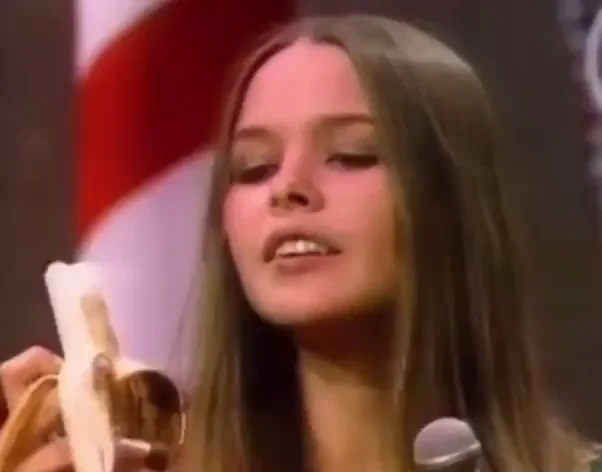 To właśnie wtedy doszło do sceny, która po latach zaczęła żyć własnym życiem. Michelle Phillips, zamiast udawać z pełną powagą perfekcyjny występ na żywo, zaczęła jeść banana w trakcie nagrania. Widzowie mogli zobaczyć coś, co kompletnie burzyło telewizyjną iluzję: głos leciał z nagrania, a jedna z wokalistek spokojnie jadła owoc, jakby chciała powiedzieć: „skoro mamy udawać, to przynajmniej nie będziemy udawać, że to prawdziwy koncert”. Dlatego przez lata opowiadano tę scenę jako cichy protest przeciwko wymuszonemu playbackowi.