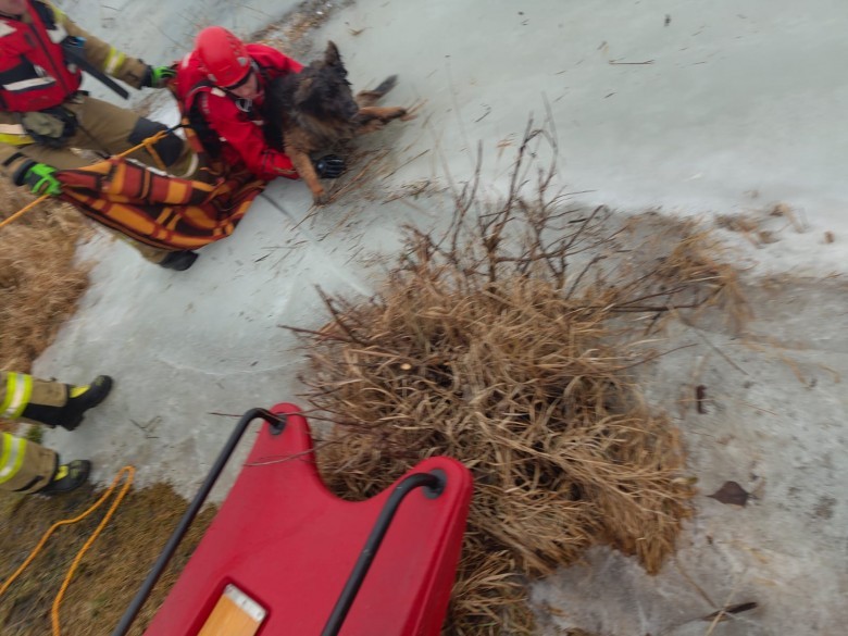 Ratownik w kombinezonie do działań na wodzie, asekurowany liną, dotarł po lodzie do uwięzionego psa i ewakuował go na brzeg. Cała akcja była prowadzona tak, by nie narażać ani zwierzęcia, ani ratowników.