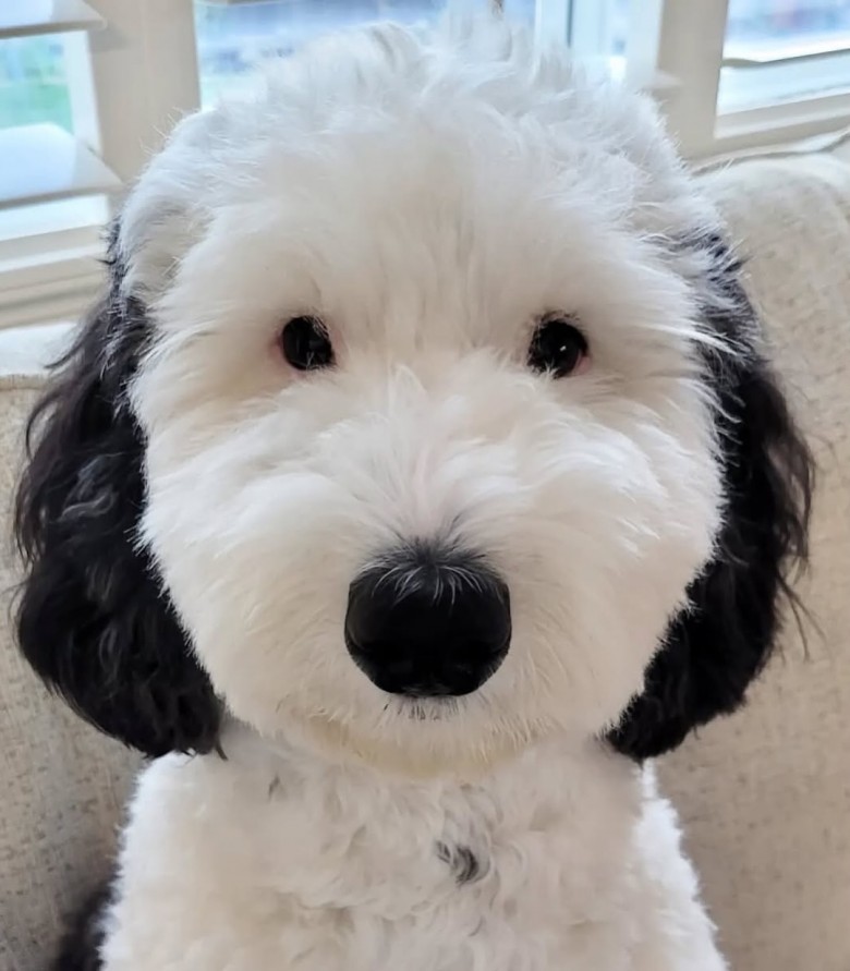 Bayley to nie animacja ani efekt sztucznej inteligencji. To prawdziwy pies rasy sheepadoodle, czyli krzyżówka owczarka staroangielskiego i pudla. Charakterystyczna biała mordka, czarne opadające uszy i duży, okrągły nos sprawiają, że na wielu zdjęciach wygląda niemal jak rysunkowa postać.