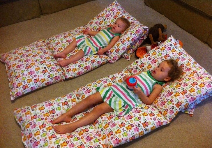 15. Zamiast wydawać fortunę na przenośne łóżka, zszyj 4 poszewki, włóż w nie poduszki i ciesz się wielozadaniowym łóżkiem, które z łatwością można wyczyścić.