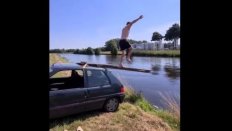 Gość postanowił wrzucić na dach swojego samochodu długie deski. Przywiązał je ładnie, aby się nie poruszyły. W ten sposób powstała mini trampolina. Nie pomyślał jednak, że coś może nie wytrzymać jego skoku. I wcale nie były to deski. Jak słychać koledzy przeczuwali, że może być zabawnie i wszystko nagrali. Poniżej możecie zobaczyć filmik z tej akcji.
