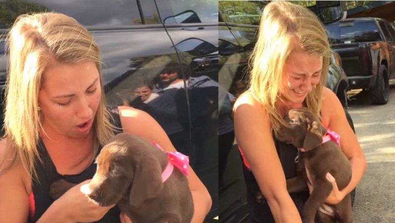 Shelby Tucker przeżyła niespodziankę swojego życia gdy jej chłopak wręczył jej szczeniaczka ze specjalną niespodzianką przywiązaną do obroży – pierścionkiem zaręczynowym. Tucker, zachwycona już samym pieskiem, rozkleiła się kompletnie po zobaczeniu pierścionka – ale dała radę odpowiedzieć „tak.”