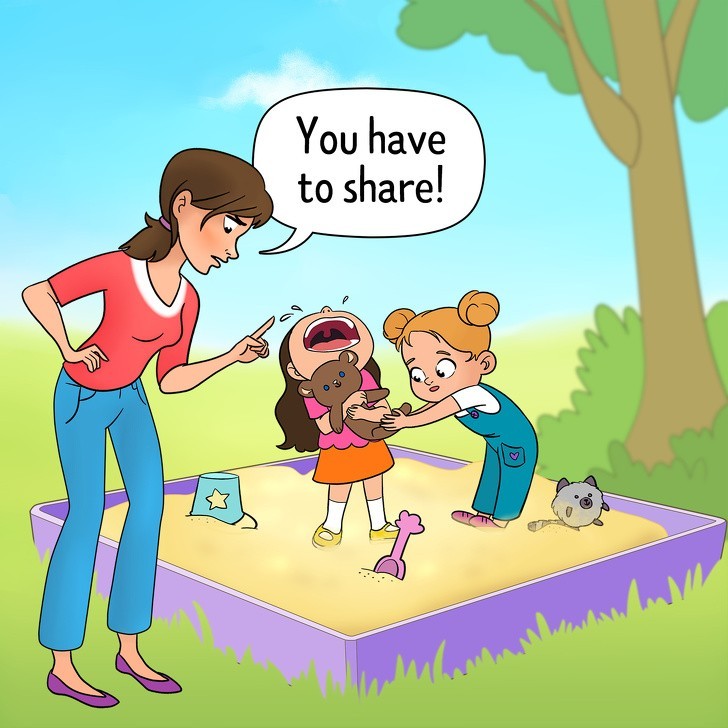 W wieku 2 lat, dziecko zaczyna rozumieć pojęcie własności. Dlatego, jeśli ktoś próbuje zabrać należący do niego przedmiot czy zabawkę, dziecko traktuje go jako intruza. Niestety, większość rodziców nie rozumie tego, zmuszając dziecko do dzielenia się by nie wyglądało ono na samolubne. Psychologowie ostrzegają jednak, że w ten sposób wychowujemy osobę, która nie będzie potrafiła radzić sobie w sytuacjach gdy trzeba komuś odmówić.