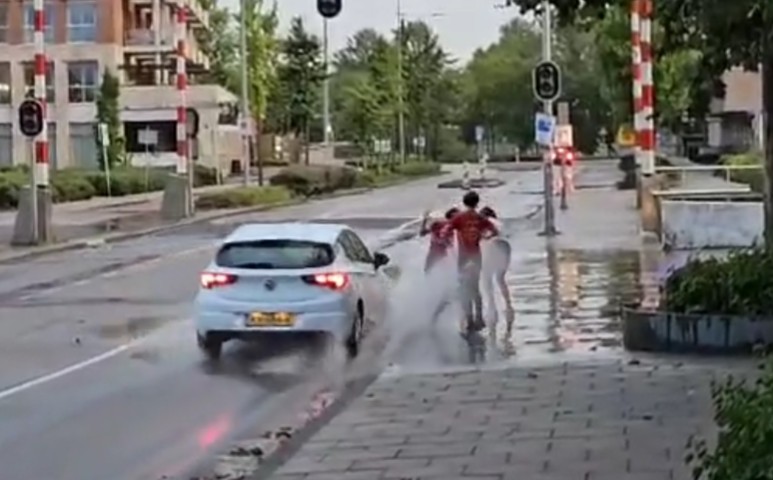 Zazwyczaj ludzie unikają sytuacji jak ta na poniższym nagraniu. Upały jednak tak doskwierały w tym roku, że dzieciaki z osiedla uznali to za świetną zabawę na ochłodę. Kiedy zobaczyli sporej wielkości kałużę, postanowili obok niej stać i czekać aż przejeżdżające auta ich ochlapią. Nie każdy zrozumiał zabawę ale sporo kierowców zaczaiło o co chodzi.
