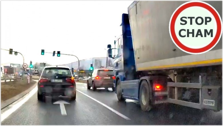 Tego jednak było mało. Gdy zjechał na prawy pas postanowił jechać z tą samą prędkością, a następnie uniemożliwić zmianę pasa. Gdy obaj się zrównali kierowca BMW postanowił jeszcze ukarać kierowcę ciężarówki (tak przynajmniej nam się wydaje, bo szukamy logiki w tym zachowaniu) za trąbienie dla niego. Jak dla nas sprawą powinna zająć się policja i nagrodzić obu panów za to, że wyłączyli myślenie podczas prowadzenia pojazdu.