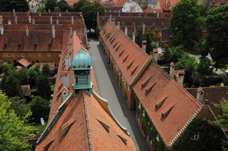 Źródło foto: „Gasse in der Fuggerei, Augsburg” - fotografia autorstwa Jensens / Wikimedia Commons, licencja CC BY-SA 4.0., „Fugger, Fuggerei-Markuskirche + Herrengasse”, autor H. Zell / Wikimedia Commons, licencja CC BY-SA 3.0.