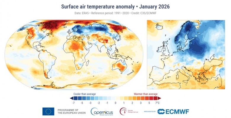 Dane programu Copernicus wskazują, że był to piąty najcieplejszy styczeń w historii pomiarów. Średnia temperatura powierzchni Ziemi wyniosła około 12,95°C, czyli o 0,51°C więcej niż norma z lat 1991–2020 i około 1,47°C powyżej epoki przedprzemysłowej.
