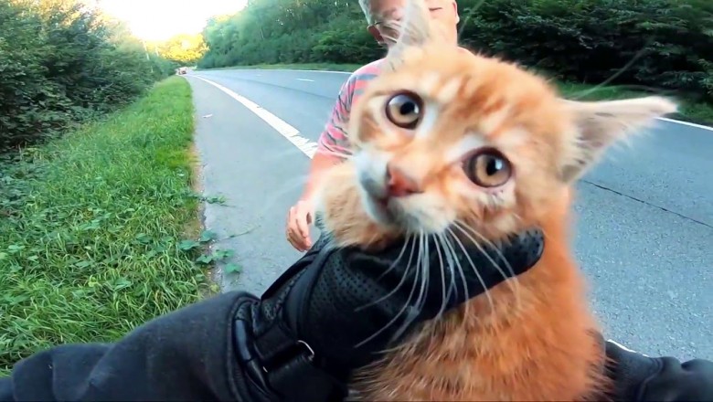 Podejrzewać tylko możemy, że zerwał się mamie spod opieki i postanowił się przejść. Nie wiedział jednak, że świat jest taki niebezpieczny i ze strachu postanowił się skulić na środku drogi. Niestety miejsce bardzo niebezpieczne i niewiele brakowało, aby na tej drodze dokonał żywota. Na szczęście zauważył go motocyklista z bardzo dobrym wzrokiem. My przy tej prędkości musieliśmy dwa razy patrzeć jak on go dojrzał. Kotek miał dużo szczęścia, bo za chwilę zatrzymał się kierowca auta, który zabrał go ze sobą. Możliwe, że kotek prosto z ulicy znalazł ciepły i przytulny, nowy dom.