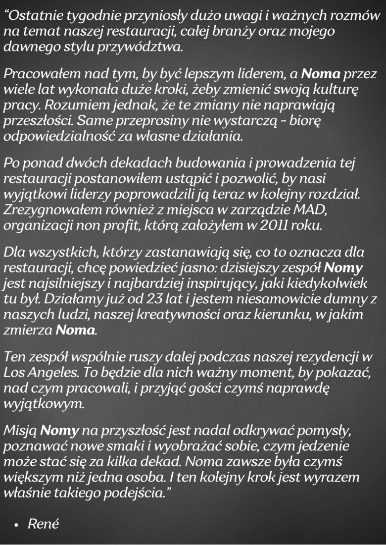 Restauracja przekazała, że w ostatnich latach wprowadziła zmiany w kulturze pracy. Wśród nich wymieniono między innymi płatne staże, poprawę godzin pracy i lepsze świadczenia dla personelu. To jednak nie zatrzymało fali krytyki. Afera odbiła się szerokim echem również poza Danią - część partnerów wycofała się ze współpracy przy pop-upie Nomy w Los Angeles, gdzie ceny kolacji sięgały 1500 dolarów za osobę.