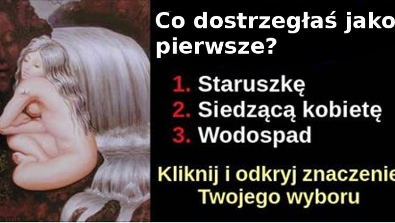 Jeśli jako pierwszy zobaczyłaś wodospad, oznacza to, że masz spokojny charakter. Potrafisz zachowywać zdrowy rozsądek nawet w najtrudniejszym momencie, a takich nie brakuje, bo raczej nie umiesz usiedzieć w miejscu. Kochasz zmiany w życiu, podróże i poznawanie nowych osób. Jesteś wolnym duchem i lubisz obcować z naturą. Nie boisz się nowych rzeczy.