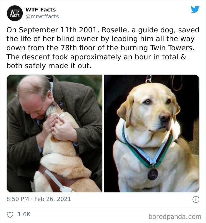 11 września 2001 roku, Roselle, będąca psem przewodnikiem, ocaliła życie swojego niewidomego pana, wyprowadzając go z siedemdziesiątego ósmego piętra płonących Twin Towers. Zejście zajęło około godziny, a zarówno pies jak i jego właściciel wyszli z budynku cali i zdrowi.