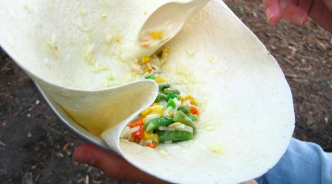 Połóż na talerzu cienką tortillę. Następnie umieść na niej twój posiłek. Po skończeniu jedzenia wystarczy przetrzeć talerz szmatką.