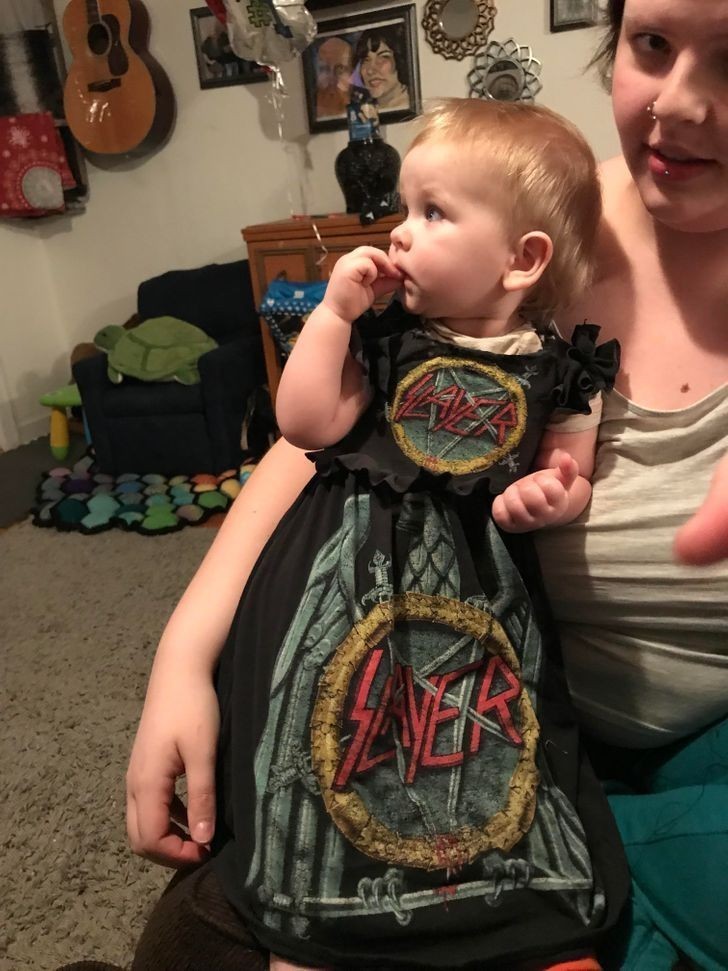 7. "Mąż dał mi kilka swoich starych koszulek zespołów, więc uszyłam naszej córce sukienkę."