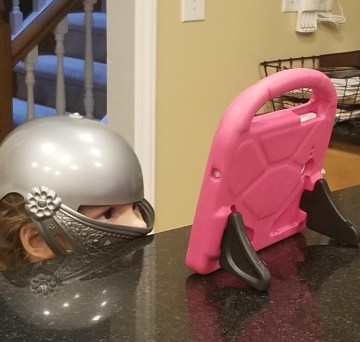 9. "Moja córka oglądała na tablecie coś, co ją przestraszyło, więc wróciła z ochronnym nakryciem głowy."