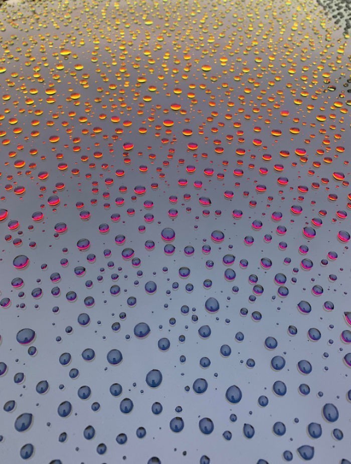 3. Krople wody na szybie samochodu podczas zachodu słońca