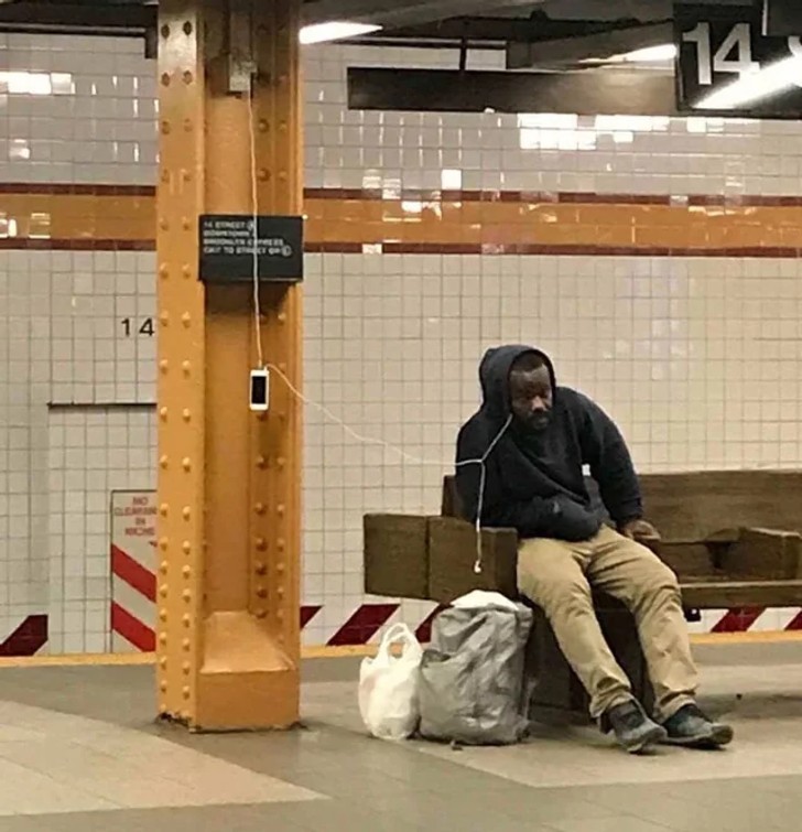 13. "Ten mężczyzna w metrze ma ochraniacze na butach."