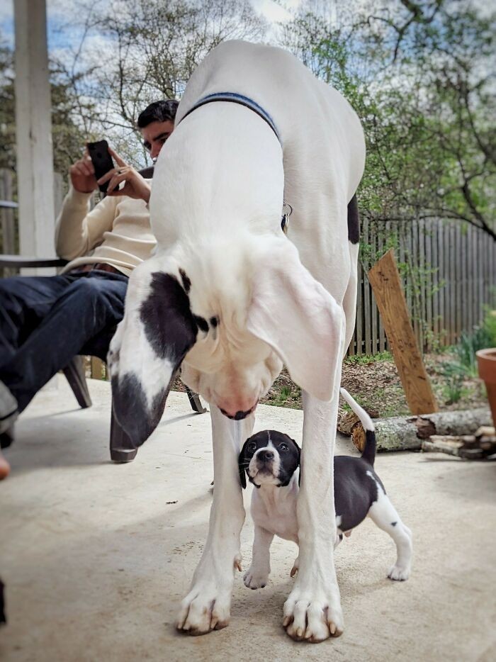 17. "Nasz sąsiad wysłał mi to zdjęcie. Podstawił swojemu psu stołek, aby mógł przywitać się z naszym olbrzymem."