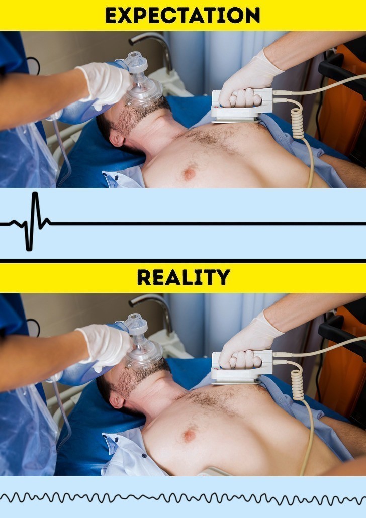 W rzeczywistości wykorzystuje się je przy nieregularnym rytmie serca, w celu unormowania go. Nikt też nie pociera "łyżek" przed użyciem defibrylatora.