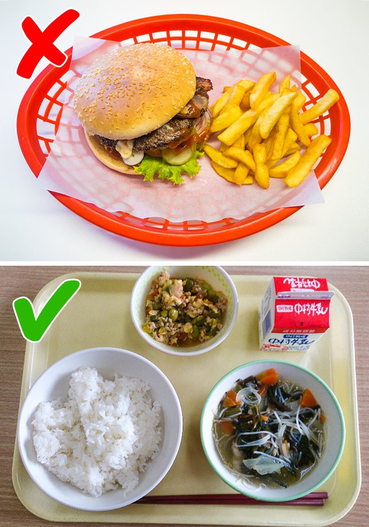 Posiłki w japońskich szkołach zaprojektowane są tak aby dostarczać potrzebnych składników odżywczych przy jak najmniejszej ilości pożywienia. Zwykle serwuje się tam ryż, warzywa, miso, i rybę bądź mięso.
