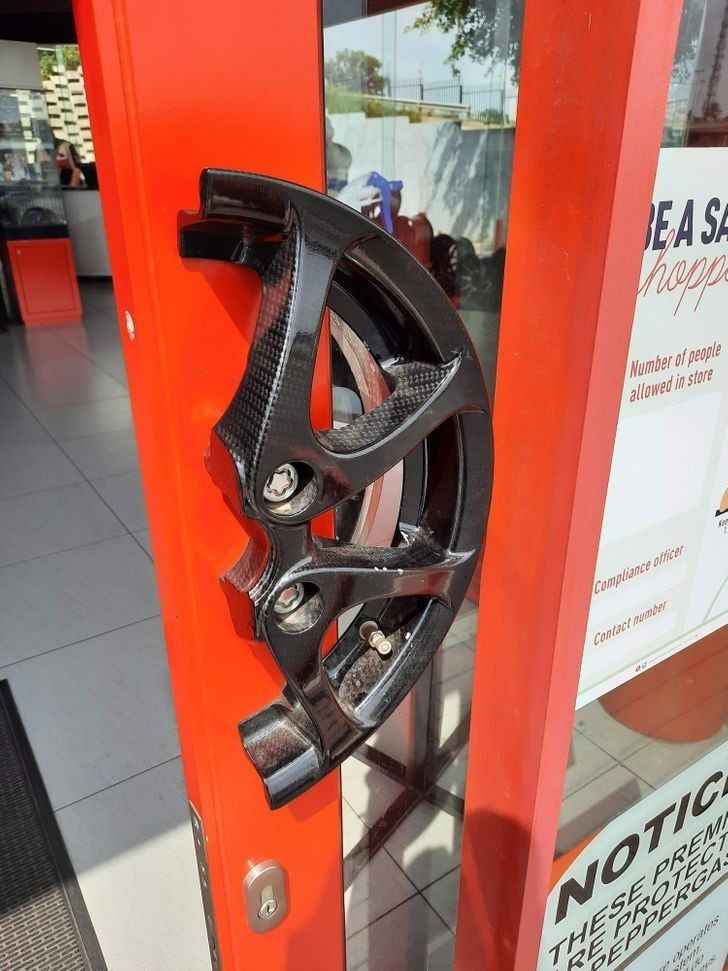 13. "Miejscowy sklep motoryzacyjny wykorzystuje felgi jako uchwyty rozsuwanych drzwi."