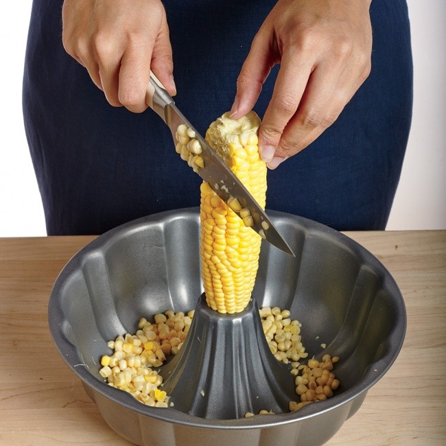 Ustaw kolbę na formie do babki i po prostu zetnij ziarna przy pomocy ostrego noża, wykonując pionowe cięcia. Forma posłuży też za miskę, dzięki czemu ziarna nie rozsypią się po całym blacie.